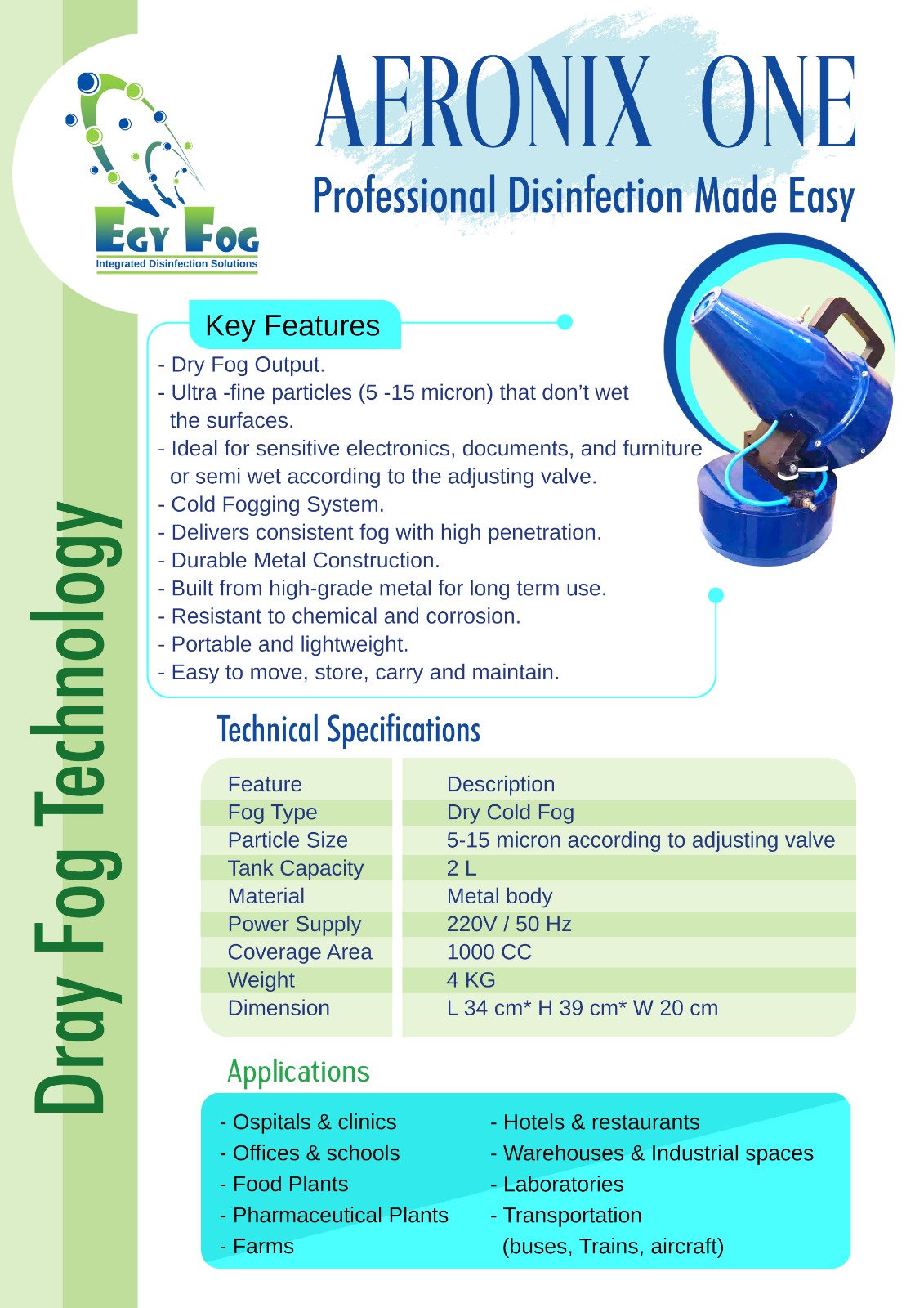 Constructed with a durable, high-grade metal body, AERONIX ONE guarantees long-term use, resistance to chemicals and corrosion, and reliable performance. Its compact, lightweight, and portable design makes it easy to operate, store, and maintain, providing a convenient solution for professional disinfection needs.