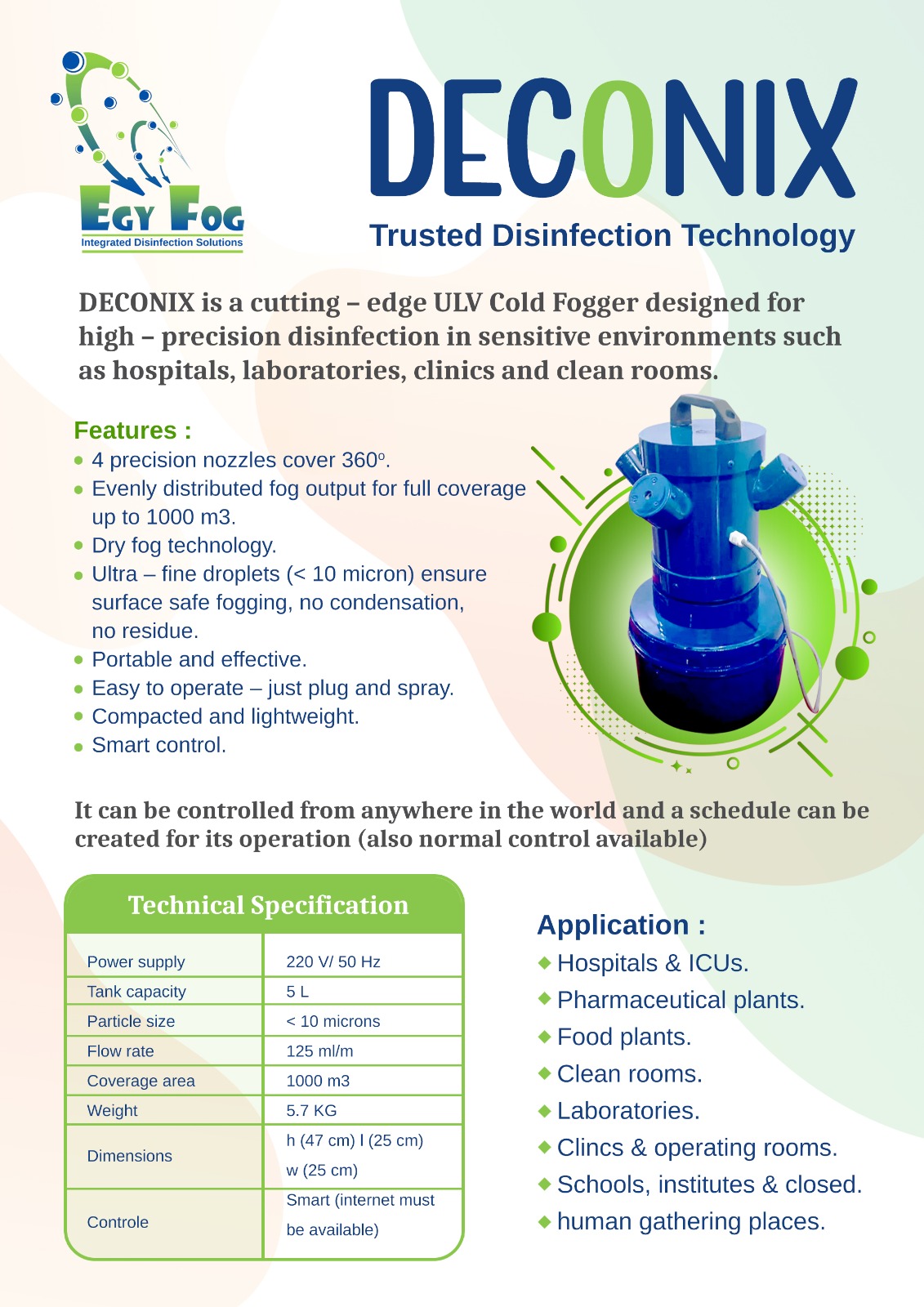 DECONIX is a state-of-the-art ULV Cold Fogger engineered for high-precision disinfection in sensitive environments such as hospitals, laboratories, clinics, and clean rooms. Equipped with 4 precision nozzles providing 360° coverage, the device delivers evenly distributed fog output for maximum efficiency, covering areas up to 1000 m³. Using advanced dry fog technology, DECONIX produces ultra-fine droplets (<10 microns) that ensure surface-safe fogging with no condensation and no residue. Lightweight, compact, and highly effective, DECONIX is designed for easy operation – simply plug and spray. With its smart control system, it can be operated and scheduled remotely from anywhere in the world, in addition to normal manual control.